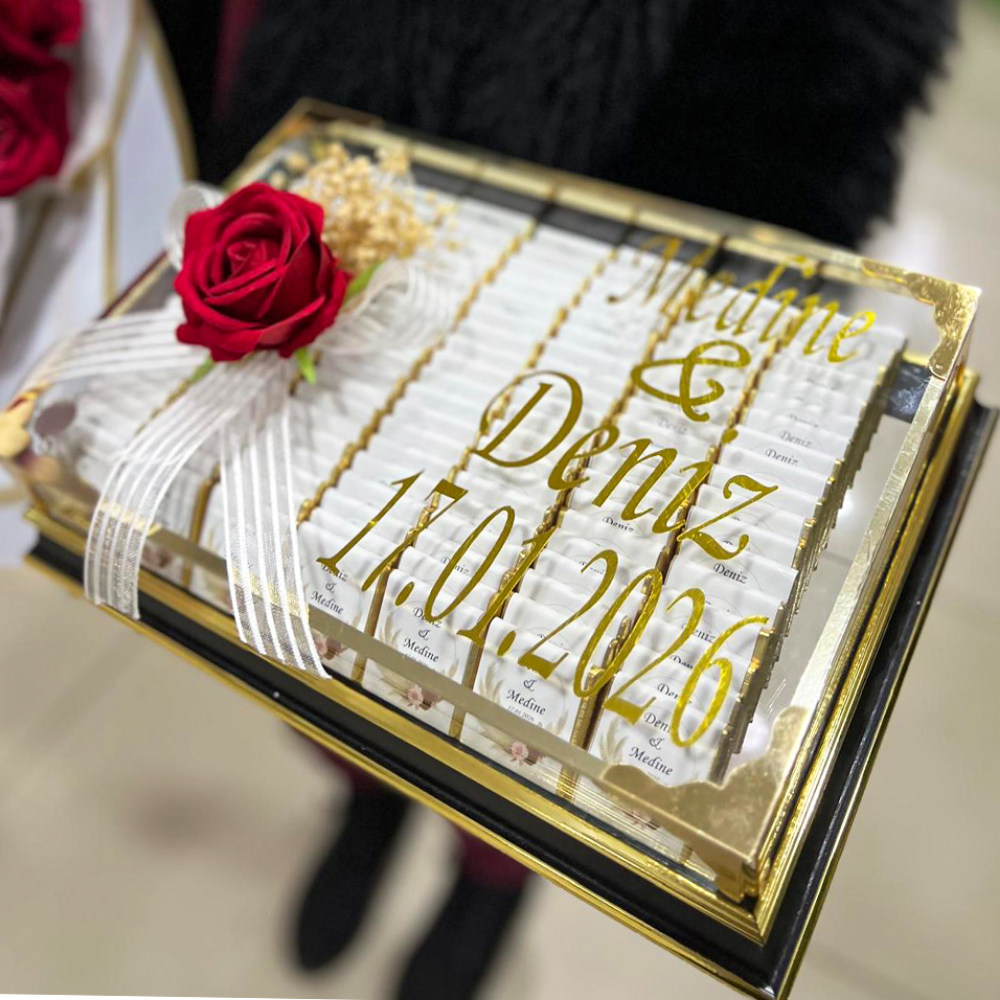 Özel anları unutulmaz kılmak için tasarlanan bu kişiye özel çikolata tepsisi, isim ve tarih baskısıyla tamamen size özel hazırlanır. Gold detaylı şık tepsi, zarif kurdele ve gül süslemesiyle premium bir sunum sunar. Söz, nişan, isteme, yıl dönümü ve özel kutlamalar için hem şık hem de anlamı yüksek bir hediye alternatifidir.